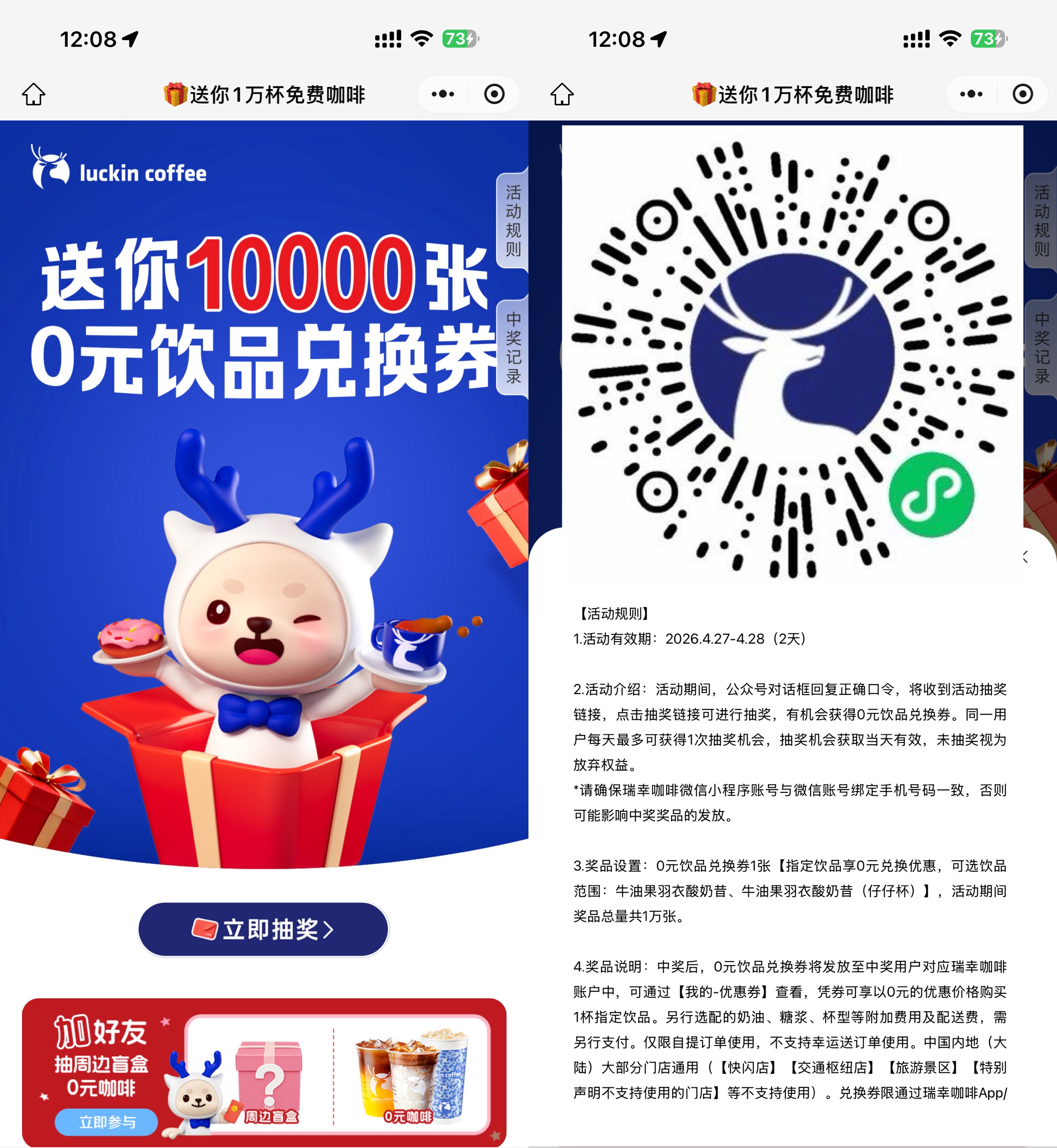 【瑞幸咖啡抽1万份饮品免单券】微信打开活动->直接抽1万张瑞幸免单券,可3款饮品任选1款兑换